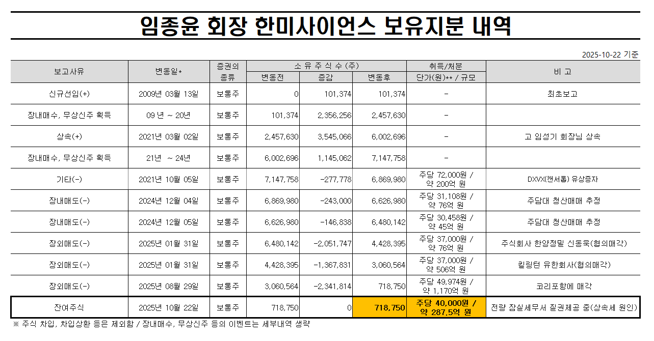 최근 25년 8월에는 유동성 확보를 위하여 약 230만 주를 본인 소유의 회사인 코리포항에 매각하였고 코리포항은 이 주식을 바탕으로 1,300억 원을 조달하여 임종윤 회장 및 매도인들에게 대금을 지급하였습니다. 25년 10월 22일 현재 공시 상 임종윤 회장이 보유한 한미사이언스 주식은 약 72만 주 이며 주당 4만원으로 추정 시 약 287.5억 원 입니다. 그러나 해당 지분은 전량 잠실세무서에 상속세 분납 이슈로 인하여 담보로 제공되어 있는 상황입니다. 상속세 5차 분납을 앞두고 있는 것으로 알려진 임종윤 회장은 납부 여부를 알 수 없으나 여전히 공시상 담보 제공이 되어 있기에 아직 납부를 완료하지 못한 것으로 추정됩니다. 5차 상속세 분납액은 알려진 것은 없으나 세무서가 통상적으로 주식으로 제공된 담보의 약 60% 수준의 담보력을 인정해주는 바 약 180억 원 수준으로 추정됩니다.