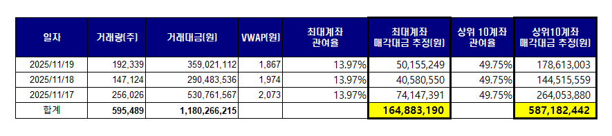 첨부된 표를 보면 주가가 폭락한 3일간 거래대금은 총 11.8억으로 이 중 이번 하락에 최대로 관여한 단일 계좌의 관여율은 13.97% 최대관여 단일계좌가 매각대금으로 챙긴 금액은 약 1.64억 수준일 것으로 추정 가능합니다.