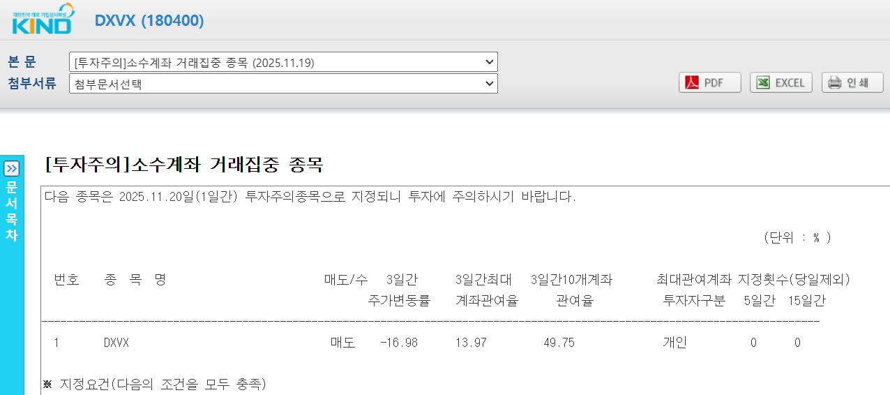 DXVX는 11월 17일(월)에서 ,18일(화) ,19일(수) 까지 3일간 약 -17%의 폭락이 있었고 이 하락은 소수계좌의 매도세에 의한 하락이었습니다. 통상적으로 이런 매매는 소수의 세력들이 어떠한 의도를 가지고 시세르 조종하는 행위일 수 있으므로 다른 투자자들이 피해를 입을 것을 예방하는 차원에서 거래소에서는 투자자에게 경고를 주기 위해 해당 공시를 올립니다.(시스템 자동 공시) 공시에 의하면 상위 10계좌가 -17% 폭락하는 동안 약 50%의 거래에 관여했고 상위 1개의 계좌는 약 14% 관여한 것으로 표시합니다.