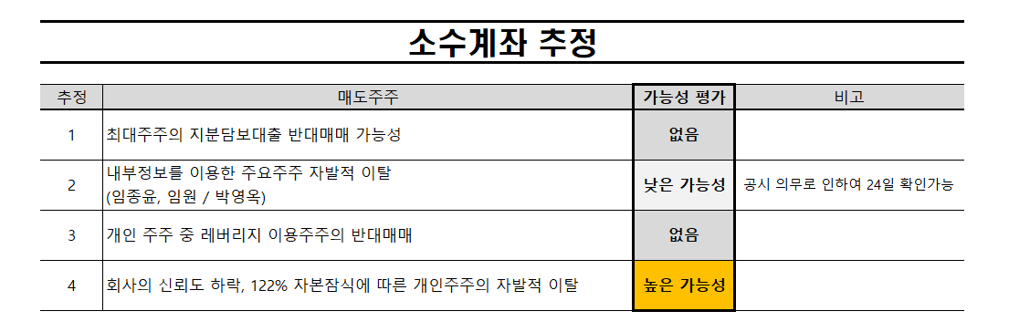 이들의 최초 이탈일을 17일로 생각할 경우 주요주주들은 모두 24일 까지는 매도 보고서를 공시해야만 합니다. 다음주면 나오겠지만 이들이 이탈했을 가능성은 굉장히 낮은 수준이라고 생각합니다. 낮은 가능성이지만 24일 18시까지 기다려보면 공시기한 마감으로 인하여 매각했는지 여부를 확인 가능할 것 입니다.