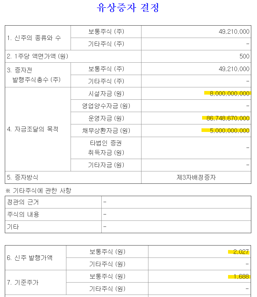 제3자 배정 유상증자 규모는 무려 997억 원 입니다. 무엇보다 주목할 점은 기준주가의 할증 발행이었다는 점 입니다.