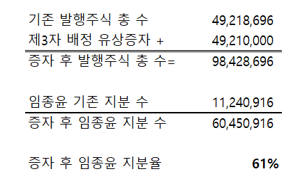 최대주주에게로 제3자 배정 후 지분율은 20%대에서 단숨에 61%로 올라가게 됩니다. 그간 임종윤 회장이 보여줬던 모습으로 보아 단기간에 주식을 던질일은 없을 것이나 1년간의 보호예수 또한 걸려있습니다. 안정적인 지배구조 확보와 함께 유통물량의 퍼센트가 상장히 잠기는 효과를 볼 수 있을 것으로 기대합니다.